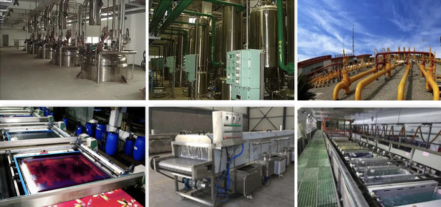 工藝場景清洗、烘干、蒸煮、消毒、制冷、染色、定型、酸洗、電鍍、壓榨、提純、脫脂、除濕、表面處理、磷化處理、鉻化處理
